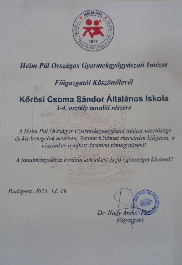 Ma pedig megérkezett a Heim Pál Országos Gyermekgyógyászati Intézet köszönőlevele is, ami hatalmas öröm és megerősítés volt a gyerekek számára.Nem azért adunk, hogy viszonzást kapjunk – mégis, ez az apró visszajelzés megmutatta nekik, hogy jót tenni jó, és hogy a szeretet mindig célba ér.